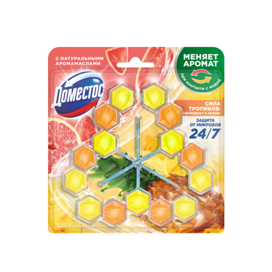 Доместос шарики для унитаза Сила тропиков — это эффективное решение для поддержания чистоты и свежести в вашем туалете. Уникальный сменный блок-ароматизатор заполняет туалетную комнату ароматом свежего грейпфрута, а при смывании – запахом сочного тропического ананаса. Подвесной блок для унитаза нейтрализует неприятные запахи 24/7, обеспечивая комфорт и гигиену.
