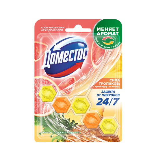 Доместос шарики для унитаза Сила тропиков — это эффективное решение для поддержания чистоты и свежести в вашем туалете. Уникальный сменный блок-ароматизатор заполняет туалетную комнату ароматом свежего грейпфрута, а при смывании – запахом сочного тропического ананаса. Подвесной блок для унитаза нейтрализует неприятные запахи 24/7, обеспечивая комфорт и гигиену.