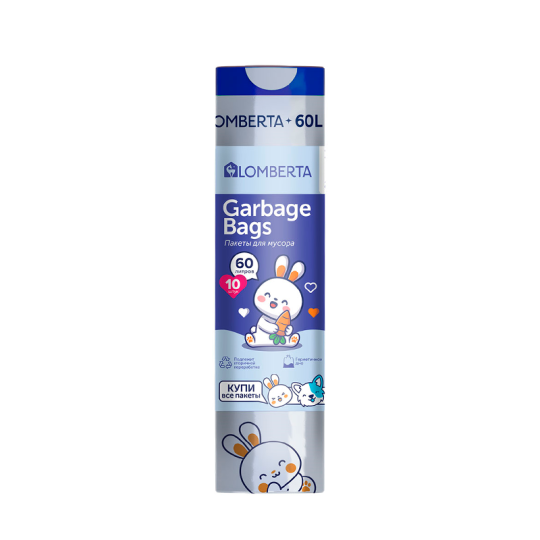 Выносите мусор по-новому! Мешки для мусора Lomberta 60 литров, 10 шт. имеют уникальные принты с различными животными. В коллекции весёлый котёнок и милый зайка. Забавные зверята не только поднимут настроение, но и помогут формировать полезные привычки у детей. Пакеты обладают высокой прочностью и грузоподъёмностью.