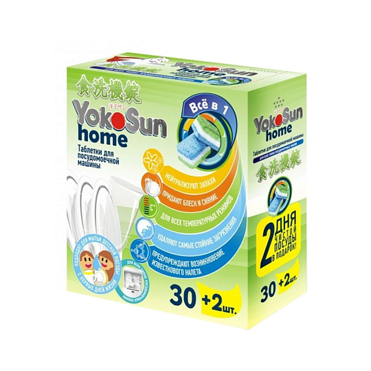 Таблетки для посудомоечной машины YokoSun. Специально разработаны для домашних посудомоечных машин всех типов. Эффективно и деликатно удаляют самые стойкие загрязнения при любых температурных режимах, не оставляя разводов на поверхности посуды и неприятного запаха. Одна таблетка включает в себя все функции таблеток All in 1.