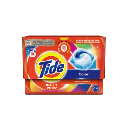 Капсулы для стирки Tide Color 10 штук предназначены для цветного и белого белья. Каждая капсула состоит из трех секций, включая мощные активные вещества для очищения, удаления сложных пятен и усовершенствованную систему защиты цвета. Оболочка растворяется даже в холодной воде. Просто загрузите капсулу Tide в барабан стиральной машины до загрузки белья и наслаждайтесь кристальной чистотой! Капсулы Tide прекрасно очищают даже загрязнения в сложных зонах, таких как воротнички, манжеты, зона подмышек.