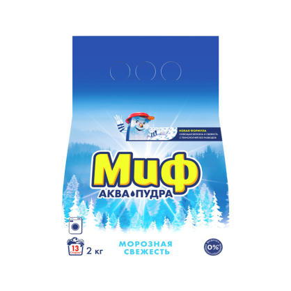 Стиральный порошок автомат Миф Морозная Свежесть для стиральных машин предназначен для стирки белого и цветного белья. Порошок для стирки Миф Морозная Свежесть отлично очищает и удаляет пятна, сохраняет яркие цвета и придает вещам приятный свежий аромат. Благодаря технологии Аквапудра, Миф Морозная Свежесть мгновенно растворяется при контакте с водой и хорошо выполаскивается.