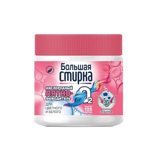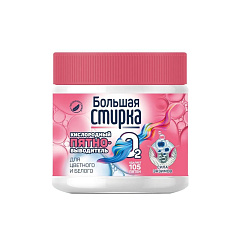 Гипоаллергенный пятновыводитель для цветных и белых тканей Большая стирка 250 г на основе активного кислорода - предназначен для удаления белковых и крахмальных загрязнений, пятен от ягод, фруктов и кофе с изделий из натуральных и синтетических тканей (кроме натуральных шелка и шерсти). Обладает антимикробным эффектом.