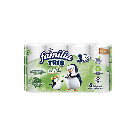 Трехслойная туалетная бумага Familia Trio изготовлена из 100% натуральной целлюлозы.