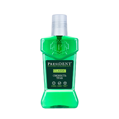 Ополаскиватель PRESIDENT Classic свежесть трав прекрасно освежает полость рта, укрепляет эмаль и служит дополнительной профилактикой кариеса.