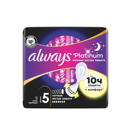Гигиенические прокладки Always Platinum обеспечивают лучшее сочетание комфорта и защиты среди прокладок Always. Always Platinum более комфортны (по сравнению с Always Ultra) благодаря тысячам микроподушечек и новым, мягким как шелк крылышкам. Они также обеспечивают лучшую защиту (по сравнению с Always Ultra) благодаря защитным боковым барьерам и ультравпитывающему внутреннему слою, который запирает влагу внутри. Always Platinum Secure Night (Размер 5) с крылышками рекомендованы для ночного использования, благодаря удлиненной на 60% задней части.
