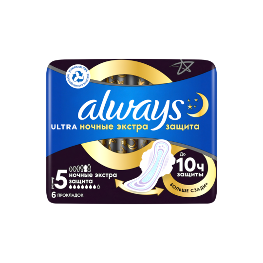 Для дополнительной защиты ночью попробуйте Always Ultra Secure Night Plus (ночные экстра защита плюс) (Размер 5) — лучшие гигиенические прокладки Always для защиты в ночное время.