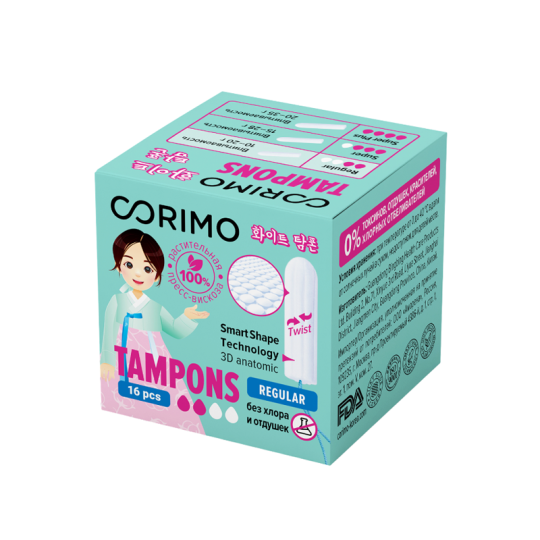 Тампон Corimo принимает естественную форму внутри тела благодаря адаптивной технологии 3D-впитывания SmartShape Technology. При любом положении тела тампон не ощущается внутри и применение не вызывает неприятных ощущений. Скругленный и мягкий кончик обеспечивает комфортное введение, мгновенно впитывает и равномерно распределяет жидкость. Специальное микроволоконное покрытие позволяет тампону плавно скользить, не принося дискомфорта. Для снятия пленки достаточно легкого вращения индивидуальной упаковки тампона, что обеспечивает удобство и гигиеничность. В составе тампонов не содержится токсинов, отдушек, красителей, хлорных отбеливателей, пластика, гмо. Внешняя упаковка из биоразлагаемого картона.