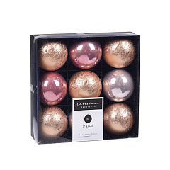 Набор ёлочных украшений. В наборе 9 шаров, диаметр 6 см, цвет розовое золото в ассортименте, упакованы в картонную коробку размером 177x177x59 мм.