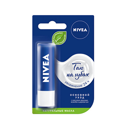Хотите защитить Ваши губы от сухости и обеспечить им уход, который длится целый день? Специальная формула бальзама для губ Основной уход от NIVEA ценными маслами: авокадо, жожоба и дерева ши обеспечивает ровную текстуру, которая мгновенно тает на губах, увлажняя их в течение 24 часов и предотвращая потерю влаги, сохраняя их мягкими и нежными. Ценные масла в составе бальзама широко применяются в косметических продуктах. Они быстро абсорбируются кожей, делают ее мягкой и эластичной. Кроме того, они получили высокую оценку экспертов в области ухода за кожей, благодаря высокому содержанию витаминов, питательных веществ, белков, антиоксидантов и полезных жиров. Подходит для использования в любое время года. В составе бальзама 96% ингредиентов натурального происхождения.