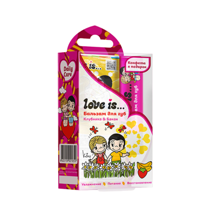 Бальзам для губ «Love is…» содержит масла ши, кокоса, миндаля, витамин Е, экстракты ромашки и календулы. Прекрасно увлажняет и питает кожу губ. Нежно розово-персиковый цвет бальзама не красит губы, а оставляет на них аромат фруктово-ягодного микса клубники и банана.