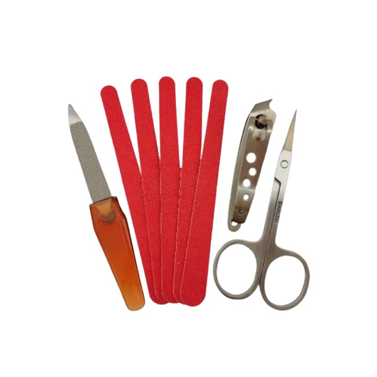 В наборе: ножницы маникюрные, пилка металлическая, пилка-полировка 5 шт и книпсер для ногтей.