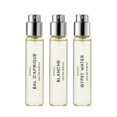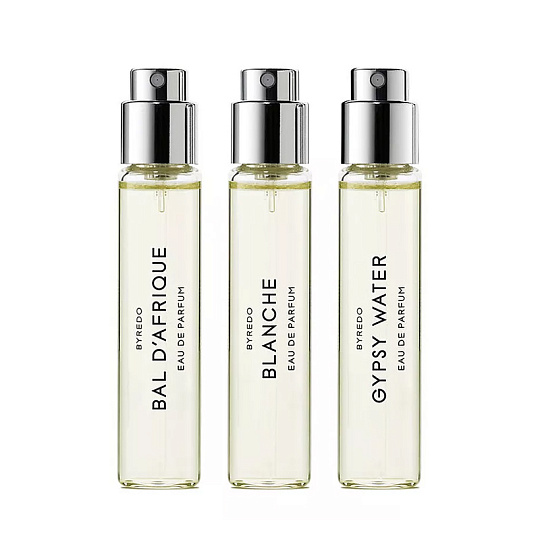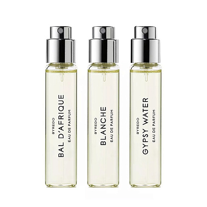 La Sélection Nomade – это трэвел-набор с тремя культовыми ароматами BYREDO: Bal d'Afrique, Blanche и Gypsy Water, представленными во флаконах 12 мл, которые идеально подходят для того, чтобы носить с собой.