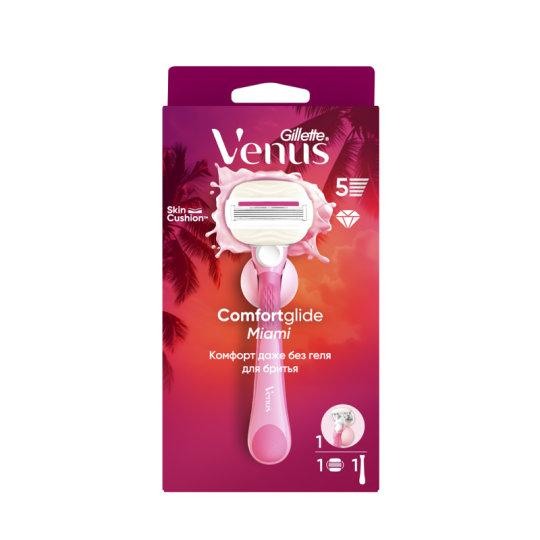 Женская бритва Venus Comfortglide Miami создана для максимально комфортного бритья в любой ситуации. Бритвенный станок дарит моментальную гладкость и повторяет контуры тела. Бритва создана c любовью и заботой о вашей коже. Представленная в каталоге бритва – 100% оригинал Venus (Венус). Преимущества: - мягкие гелевые подушечки облегчают скольжение бритвы и дарят приятный ягодный аромат; -для максимального комфорта во время процедуры; -оригинальный женский станок Venus ComfortGlide с закругленной кассетой, созданной специально для женщин, оснащен пятью плавающими лезвиями; -женский станок для бритья ног, лица и зоны бикини Venus Comfortglide Miami удобно использовать дома и в дороге. Любая сменная бреющая кассета Venus Smooth подходит к любой оригинальной бритвенной ручке Venus, кроме Simply Venus и Venus Satin Care. Комплектация: многоразовый бритвенный станок для женщин Gillette Venus Comfortglide (ручка) - 1 шт., сменная кассета - 1 шт., держатель для бритвы - 1 шт.