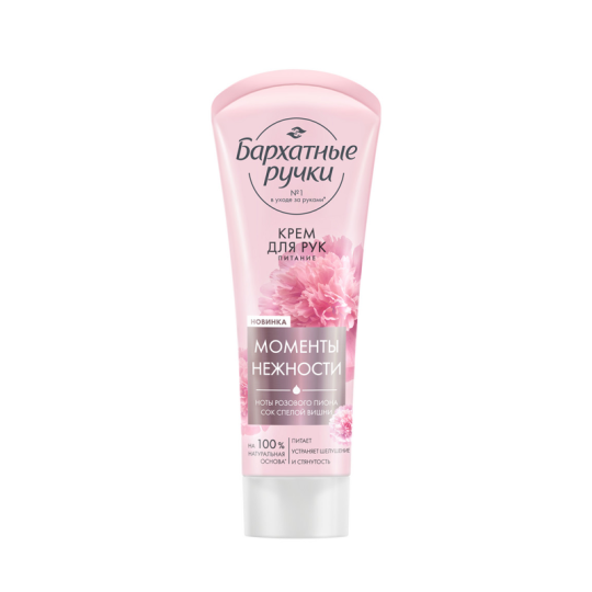 Добавьте в свой уход новинку от эксперта №1 в уходе за руками – бренда Бархатные ручки – парфюмированный крем для рук Питание Моменты нежности. Питательный крем на 100% натуральной основе отлично подойдет для сухой и очень сухой кожи. Текстура крема эффективно питает, устраняет стянутость, защищает от сухости и шелушения, при этом отлично распределяется по коже и быстро впитывается.