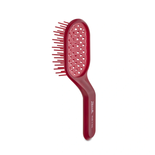Janeke Щетка для волос пластиковая, красная. Расческа из легкого пластика высокого качества изготовлена по инновационным технологиям. У нее удобная ручка, а ее форма создана для деликатного расчесывания спутанных или влажных волос. Она не повреждает волосы, не выдирает, не вызывает сечения. Корпус имеет отверстия, которые пропускают горячий воздух от фена, что позволяет равномерно высушить волосы.