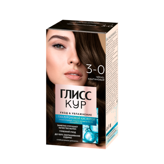 Стойкая краска для волос Глисс Кур Уход & Увлажнение с гиалуроновой кислотой 3-0 Черно-каштановый. Превосходный уход во время и после окрашивания.