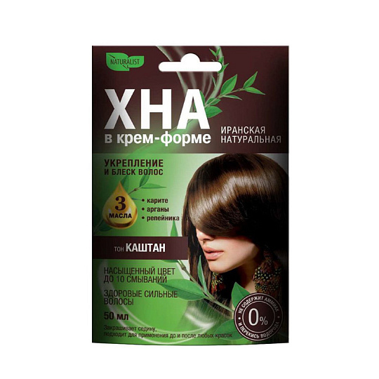 ХНА в крем-форме NATURALIST – полностью готовая к применению растительная краска для волос на основе натуральной хны с ухаживающим действием для полустойкого окрашивания. Не требует заваривания, наносится гораздо легче, чем традиционная сухая хна. Быстро окрашивает, не течет с волос во время применения и легко смывается! В результате одновременного окрашивания и интенсивного натурального ухода волосы приобретают насыщенный цвет, роскошный блеск, объём и шелковистость. Хна интенсивно окрашивает, ухаживает, восстанавливает и лечит волосы, дарит ухоженный здоровый вид. Много веков используется для окрашивания волос. Амла усиливает выбранный оттенок и обеспечивает непревзойдённый уход. Ценные масла карите (ши), арганы и репейника питают, восстанавливают убирают секущиеся кончики, дарят красивый зеркальный блеск. Протеины шелка проникают глубоко внутрь волоса и восстанавливают повреждения, в то же время создают невесомую защитную пленку на поверхности, придают силу и блеск. Эффект действия комплекса масел и протеинов шелка на структуру волос сравним с эффектом от процедуры биоламинирования.