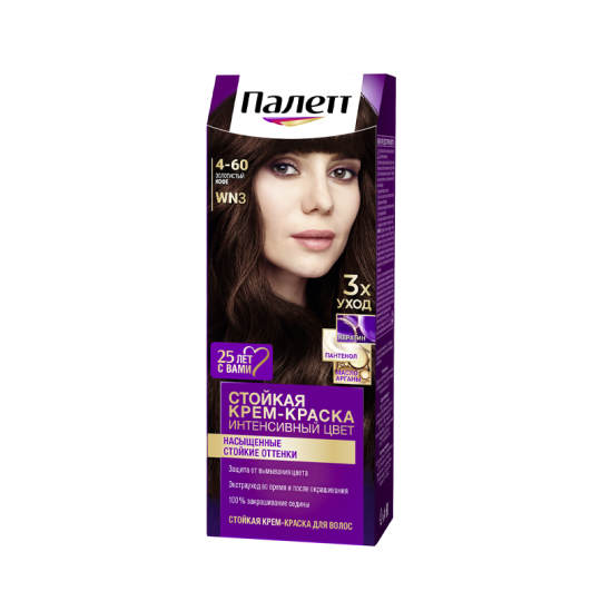 Благодаря тройной системе ухода стойкая крем-краска для волос Палетт обеспечивает бережное окрашивание. С аммиаком. Комплекс с Кератином, Пантенолом и Аргановым маслом проникает глубоко в структуру волоса, восстанавливая, увлажняя и питая его изнутри. Активные вещества оказывают смягчающее и укрепляющее воздействие, делая волосы гладкими и блестящими.